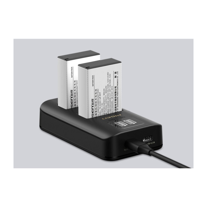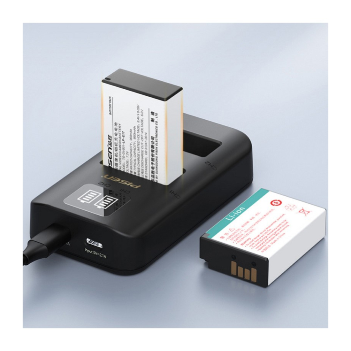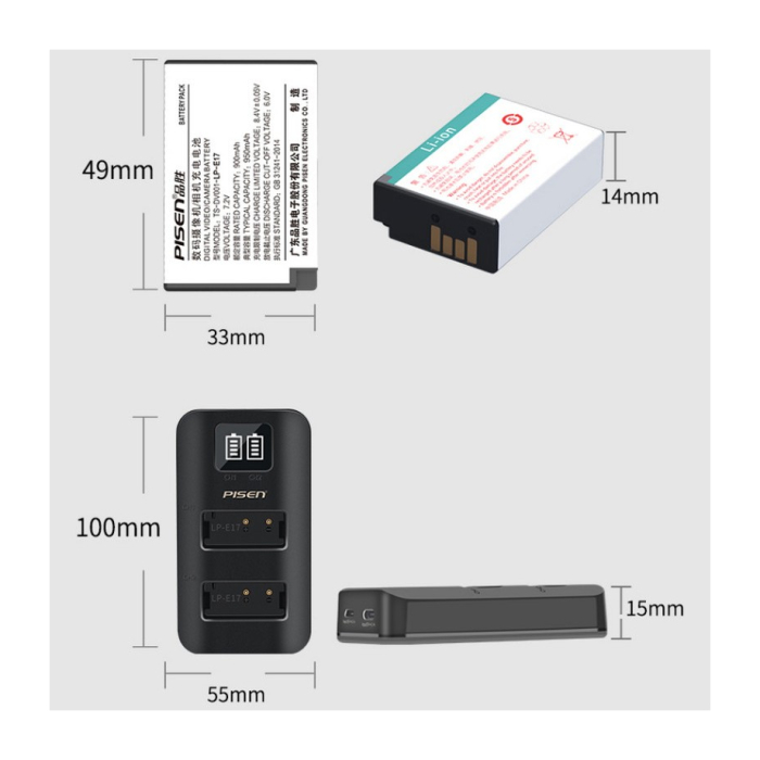Bộ 2 pin & sạc Pisen LP-E17 dùng cho Canon bao gồm một sạc và hai pin lithium-ion 950mAh tương thích với các dòng máy ảnh Canon sử dụng hệ pin LP-E17.