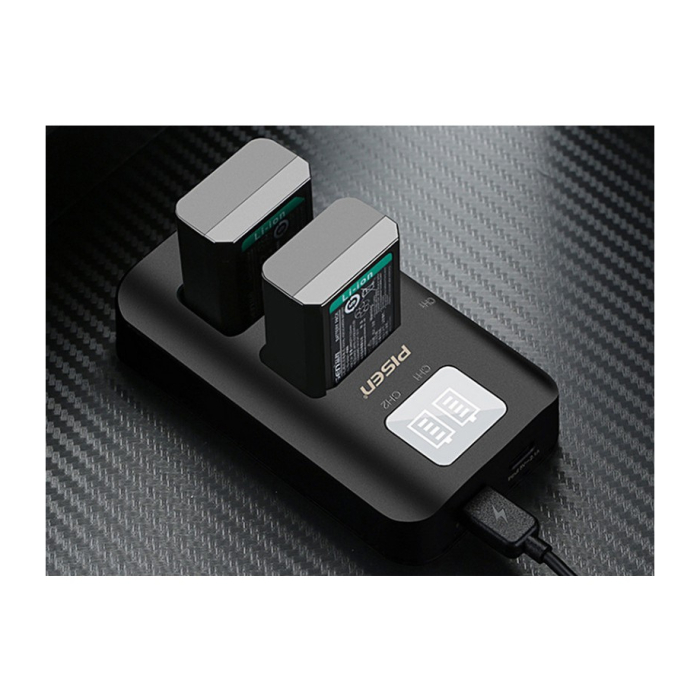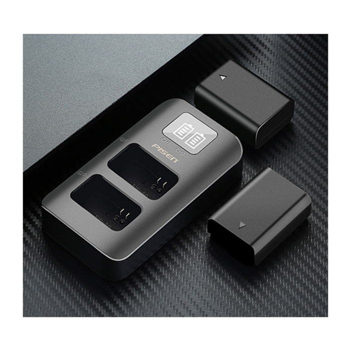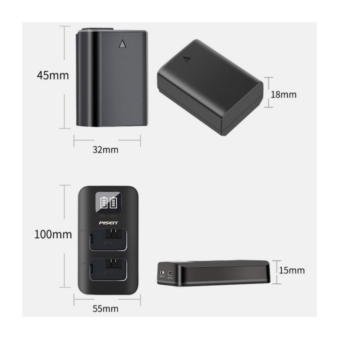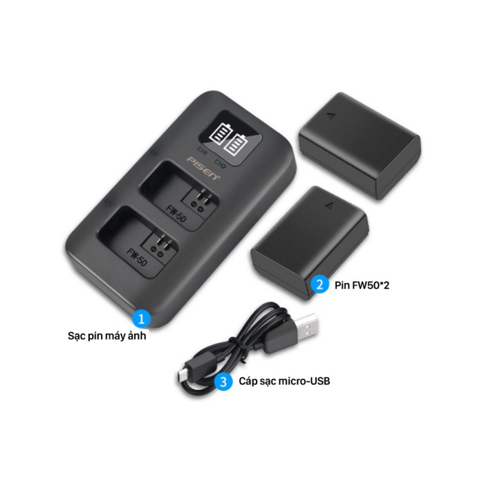 Bộ 2 pin & sạc Pisen NP-FW50 dùng cho Sony bao gồm một sạc và hai pin lithium-ion 1030mAh tương thích với các dòng máy ảnh Sony sử dụng hệ pin NP-FW50.