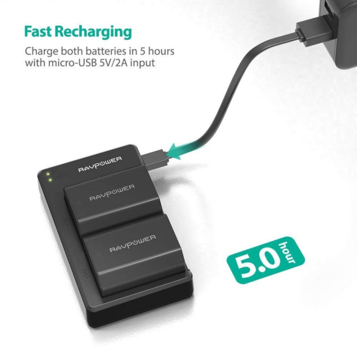Hai pin thay thế có thể sạc đầy cùng lúc chỉ trong 5 giờ đồng hồ, thông qua cổng Micro-USB 5V/2A.