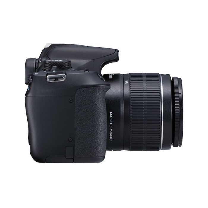Canon 1300D sở hữu thiết kế khá nhỏ gọn so với các dòng DSLR. Máy cũng có tông màu đen cổ điển như các sản phẩm đi trước. Lớp vỏ ngoài của máy được làm bằng hợp kim rất cứng cáp mang lại sự bền bỉ, phần cạnh phải của máy có góc được bọc cao su cho độ bám cao, cầm chắc tay và hạn chế trơn trượt khi bạn sử dụng.