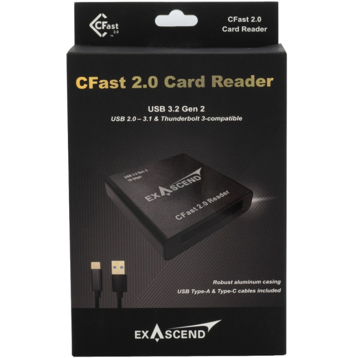 Được thiết kế để truyền tải dữ liệu nhanh chóng cho thẻ CFast 2.0 hỗ trợ USB 3.2 Gen 2 tốc độ 10 Gb/giây, đầu đọc thẻ nhớ CFast 2.0 Exascend được trang bị giao diện USB 3.2 Gen 2 Type-C mang lại tốc độ truyền dữ liệu lên tới 500 MB/s. Nguồn được nhận qua bus USB. Đầu đọc thẻ Exascend đi kèm cáp USB Type-C to Type-C và cáp USB Type-C to Type-A.