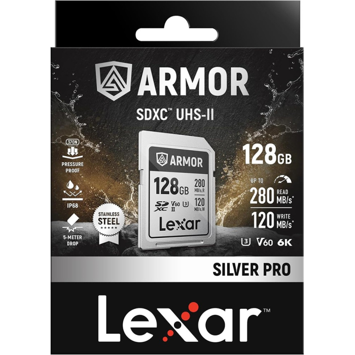 Thẻ nhớ SDXC Lexar 128GB 280MB/s thuộc dòng thẻ nhớ Armor Silver Pro Series SDXC UHS-II - dòng thẻ nhớ đầu tiên trên thế giới sử dụng vật liệu thép không gỉ để bảo vệ dữ liệu của bạn. Được chế tạo bằng thép không gỉ siêu bền và được xếp hạng IP68, thẻ Lexar Armor Silver Pro Series SDXC UHS-II được thiết kế để chịu được những cú va chạm khi bạn khám phá thiên nhiên hoang dã. Từ việc chịu đựng những điều kiện khắc nghiệt và chịu được những cú rơi cho đến việc chống chọi với thời tiết, thẻ nhớ này đã sẵn sàng cho cuộc phiêu lưu. Được xếp vào chuẩn tốc độ video 60 (V60), thẻ này quay phim liền mạch ở độ phân giải 6K mà không bỏ lỡ khung hình nào.