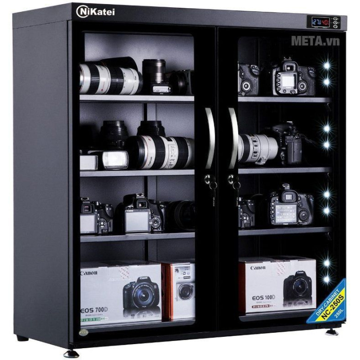 - Tủ chống ẩm cao cấp Nikatei NC-250S (235 lít) có dung tích tủ 235 lít giúp bảo quản được nhiều thiết bị hơn. Vỏ làm bằng tôn dày sơn tĩnh điện, dùng để bảo quản thiết bị như máy ảnh, vật dụng trong ngành y tế, điện tử, ngành in hay các hiện vật trong bảo tàng.